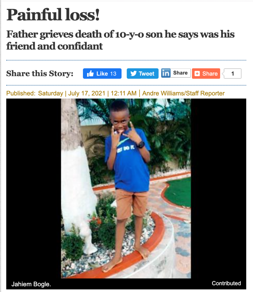 The headline of today’s edition of the Jamaica Gleaner newspaper reads PAINFUL LOSS. It’s accompanied by a photo of a 10-year-old, slim built, handsome and intelligent-looking boy, clad in brown short pants, bright blue T-shirt, standing bare-footed on a narrow curb wall with both hands joining in the form of an emoji like “love you gesture”, and a mischievous look on a face slightly bowed.