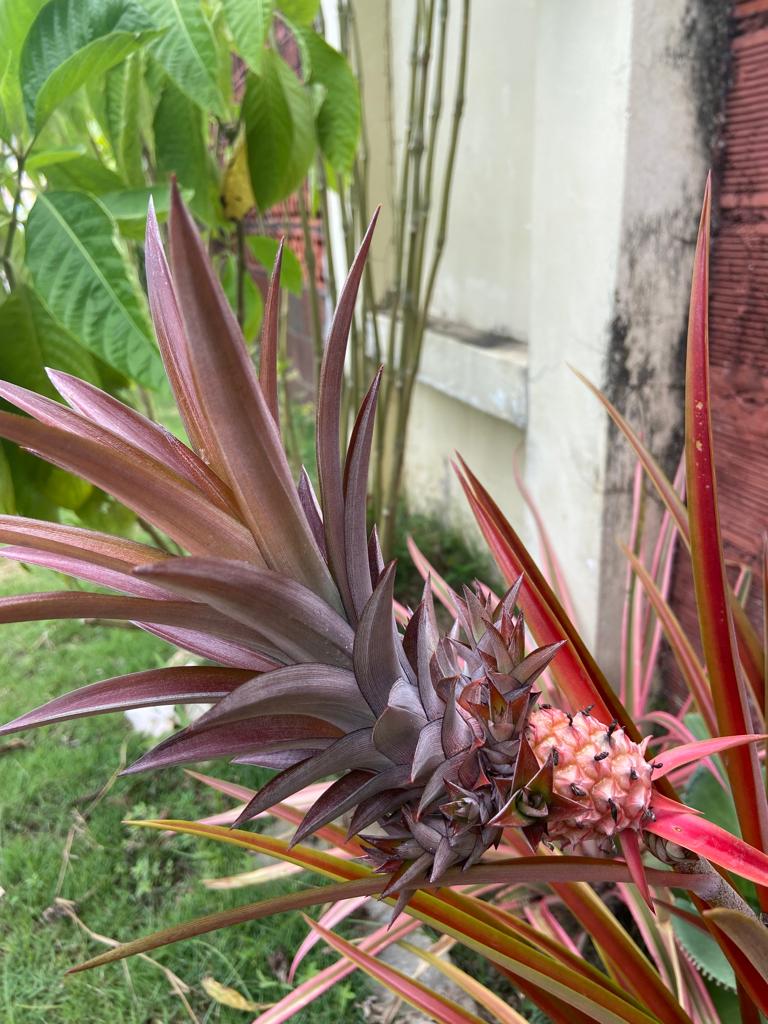 Aroused by an exotic pineapple plant in my garden producing a tiny fruit with multiple baby fruits at its base.